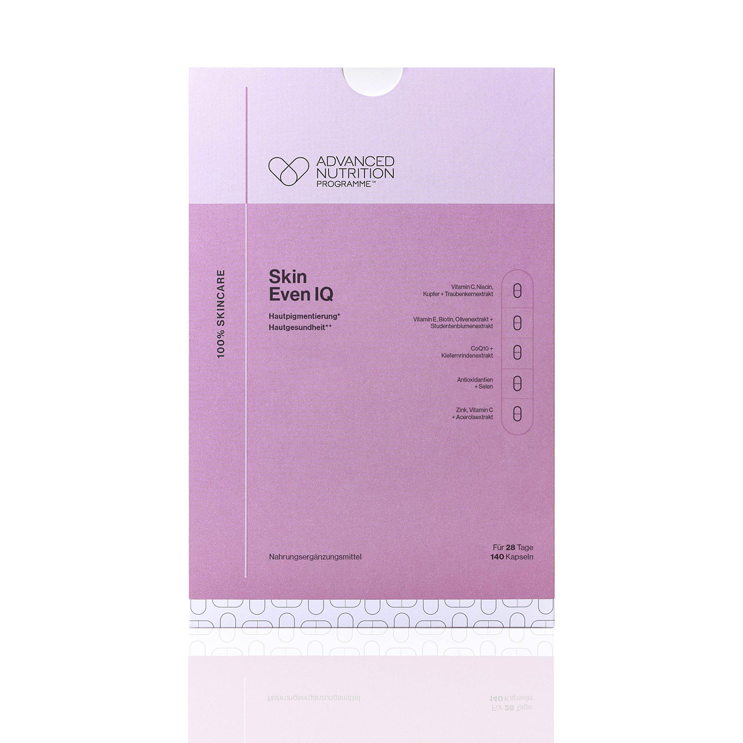 Skin Even IQ wurde sorgfältig kalibriert und erforscht und ist ein wissenschaftlich fundiertes, intelligentes Nahrungsergänzungssystem, das hilft, hartnäckiger Pigmentierung entgegenzuwirken*. Clever verpackt in schützenden Kapseln, haben die ANP Hautforscher ein System zur täglichen Einnahme von fünf intelligenten Kapseln entwickelt: Skin Bright, Skin Blue Filter, Skin Antioxidant, Skin Vit C und Skin Co-Q10+ für einen ebenmäßigen Hautton** und einen strahlenden Teint. Inhalt 144 Kapseln für 28 Tage.