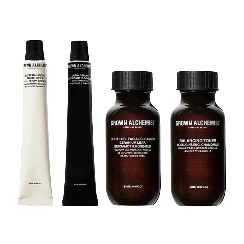 Die limitierte Editon mit 20% Preisvorteil enthält: Gentle Gel Facial Cleanser 50ml, Balancing Toner 50ml, Detox Serum 10ml + Matte Balancing Moisturiher 12ml)