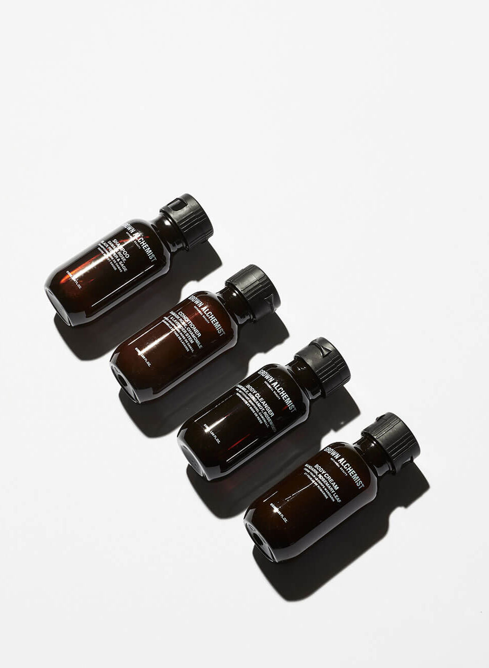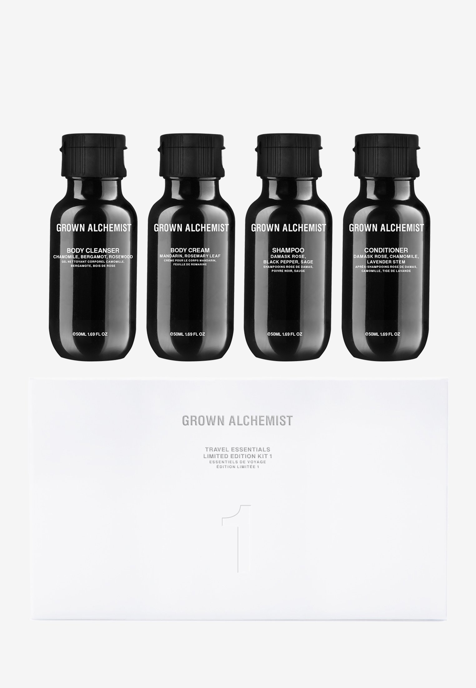 Der ideale Reisebegleiter von GROWN ALCHEMIST - die praktischen Reisegrößen mit den 4 wichtigsten Produkten für Körper und Haar: