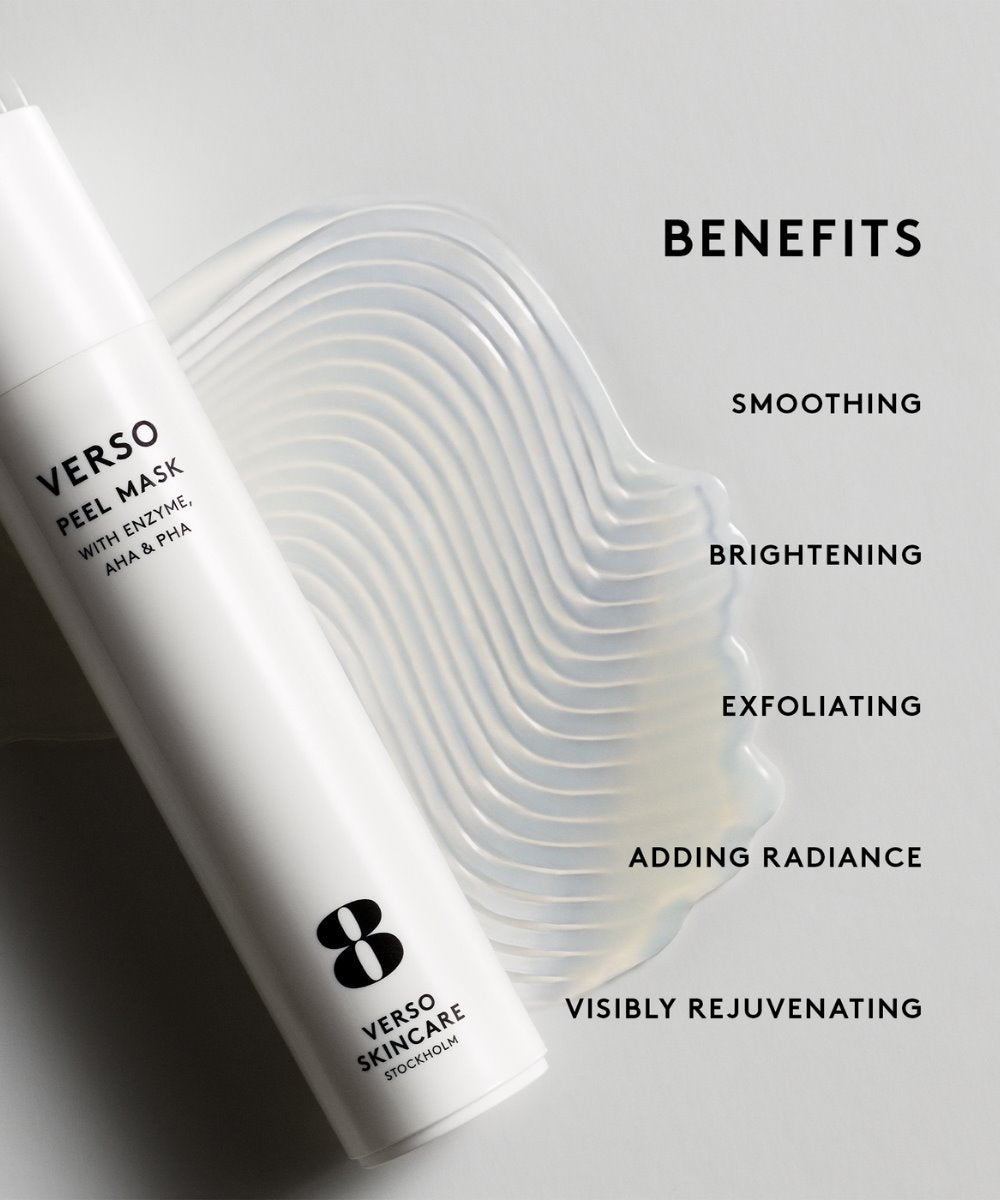 Die Peeling Mask von VERSO Skincare verleiht sofort einen strahlenden, frischen Haut-Glow. Das sanft peelende Gel aus Enzymen, Alpha- und Poly Hydroxy Säuren entfernt sanft Hautunreinheiten, klärt verstopfte Poren und löst abgestorbene Hautzellen, die den Teint stumpf aussehen lassen. Der Teint wird strahlend, ebenmäßig und samtig weich. VERSO Skincare verwendet nur wenige, ausgewählte Inhaltsstoffe von höchster Qualität, die die Hautalterung verlangsamen und die Haut lange schön erhalten. Klinische Studien belegen, daß eine regelmäßige Anwendung von VERSO Skincare zu einem ebenmäßigeren und strahlenderen Teint führt. VERSO Skincare Produkte sind frei von Mineralölen, Parabenen und künstlichen Farbstoffen. Veganes Produkt.